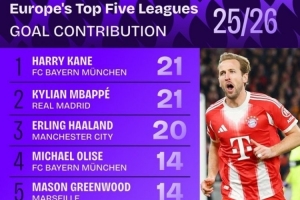 2025-26賽季五大聯(lián)賽參與進球(進球+助攻)數(shù)據(jù):