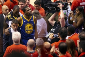 杜蘭特回憶道:“我記得當時兩場比賽之間大概有兩天時間,所以我基本上24小時不間斷地在接受治療,我甚至要跑到多倫多城外大概45分鐘車程的地方,去做那種水下跑步機的訓練。總之,我盡了一切努力去恢復,我想回來打球,我開始感覺好一些了,然后在比賽前一天,我和隊友們打了三對三的訓練。”