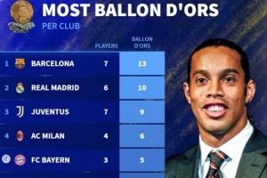 俱樂部球員奪金球次數(shù)排名:巴薩7人13次居首,皇馬6人10次第2