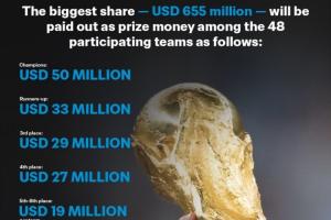 體育資訊12月18日訊 國際足聯(lián)官方昨日公布2026世界杯的獎金分配方案,獎金總額7.27億美元,冠軍獎金5000萬美元,參賽即可拿1050萬美元。