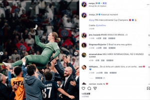 他也在今日通過社媒曬出自己被隊友們拋上空中慶祝的照片,并配文:“歷史性時刻。巴黎贏得了洲際杯冠軍??????感謝我的經(jīng)紀公司。”