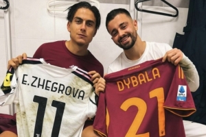 賽后迪巴拉還和尤文球員熱格羅瓦交換了球衣,兩人在更衣室內(nèi)合影留念。