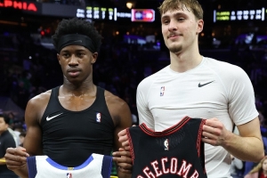 賽后,獨行俠狀元弗拉格和76人探花秀VJ·埃奇庫姆交換了球衣。