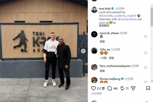 克羅斯社媒曬出合照,配文:“看看誰來青訓(xùn)學(xué)院了?與羅馬里奧的專訪即將發(fā)布。”