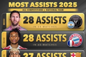 以下是2025年年度助攻榜單(俱樂(lè)部+國(guó)家隊(duì)各項(xiàng)賽事):