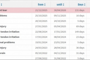 在2025/26賽季,遭遇感冒、小腿傷病和韌帶撕裂,預計缺席152天,預計錯過23場比賽。