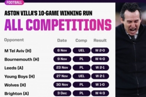 在球隊(duì)作為頂級聯(lián)賽俱樂部的111年時間里,維拉首次取得正式比賽10連勝。而且,這也是他們自1990年以來,首次在頂級聯(lián)賽中取得7連勝。