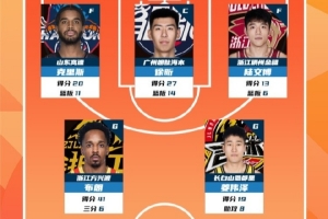 2025-2026賽季CBA聯(lián)賽常規(guī)賽第4輪結(jié)束較量,來自山東高速籃球俱樂部的克里斯,龍獅籃球俱樂部的徐昕,浙江稠州籃球俱樂部的陸文博,浙江廣廈籃球俱樂部的布朗和吉林東北虎男籃的姜偉澤入選CBA聯(lián)賽常規(guī)賽第4輪最佳陣容!
