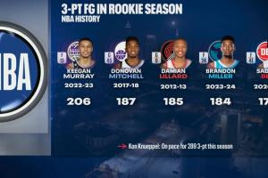 克尼佩爾今天生涯第29場比賽已命中100記三分,新秀歷史最快!
