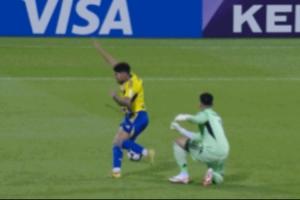 比賽第50分鐘,阿布扎比統(tǒng)一沙姆西逆天大腳掄空,隨后拉倒對手,VAR介入沙姆西吃到“紅點”套餐,但隨后布拉希米的點球卻打在橫梁上。
