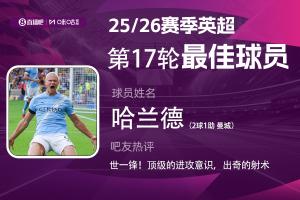 2025-2026賽季英超火熱進(jìn)行中,體育資訊和咪咕體育聯(lián)合發(fā)起每輪英超最佳球員評(píng)選活動(dòng)!第17輪評(píng)選結(jié)果已經(jīng)出爐,曼城前鋒哈蘭德(42984票)力壓羅杰斯(34236票),連續(xù)兩輪當(dāng)選!