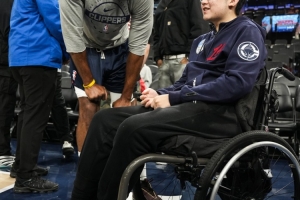 快船官方賽后曬出哈登與中國留學生約翰·郝?lián)肀У恼掌⑴湮模焊兄x哈登的幸運符!