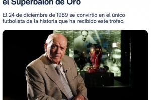 1989年12月24日,阿爾弗雷多·迪斯蒂法諾被授予超級金球獎,《法國足球》雜志以此向這位皇馬傳奇的偉大職業(yè)生涯致敬,他在最終評選中力壓克魯伊夫與普拉蒂尼,至今為此,《法國足球》只頒發(fā)過此獎項一次,因此迪斯蒂法諾是唯一擁有此項榮譽的足球運動員。