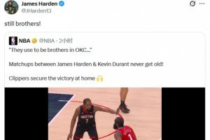 賽后,NBA官推曬出哈登與杜蘭特對位的集錦,并配文道:“他們在雷霆時曾經(jīng)是兄弟,哈登與杜蘭特的對位百看不厭,快船在主場確保了勝利。”