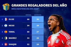 體育資訊12月25日訊 德國(guó)轉(zhuǎn)會(huì)市場(chǎng)統(tǒng)計(jì)了球員2025年俱樂(lè)部+國(guó)家隊(duì)的助攻次數(shù),并列出榜單,奧利塞30助居首,梅西29助次席。