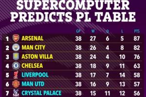 根據(jù)超級計算機的預測,阿森納將以87分奪得英超冠軍,曼城82分第二,阿斯頓維拉、切爾西進入前四,利物浦、曼聯(lián)分列第五、第六,狼隊將以10分創(chuàng)造英超歷史最低分紀錄。
