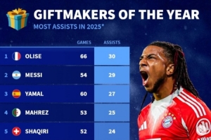 體育資訊12月25日訊 德轉官方社媒列出2025年度足壇助攻榜,拜仁球員奧利塞以66場30次助攻居首,邁阿密國際球員梅西54場29次第二。