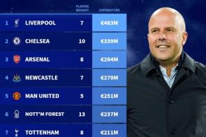 體育資訊12月26日訊 德轉(zhuǎn)統(tǒng)計了本賽季俱樂部引援花費排行,利物浦4.83億歐領(lǐng)跑,前十英超球隊占9席。