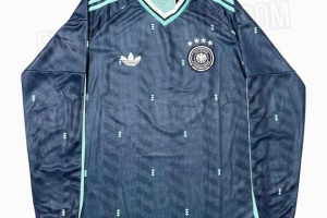 媒體曬出2026年世界杯德國隊長袖版客場球衣諜照,這款球衣由阿迪達斯設計,主色調為深海軍藍,領口、袖口、三道杠則為薄荷綠。