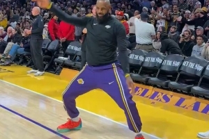 GIF-詹姆斯賽前底線天勾命中 激情舞動(dòng)慶祝