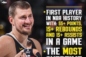 本場比賽,約基奇通過自己得分和助攻,合計為掘金貢獻了96分,歷史第三高。