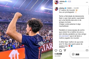 體育資訊9月24日訊 在獲得金球獎第三名后,巴黎中場維蒂尼亞更新了社交媒體。