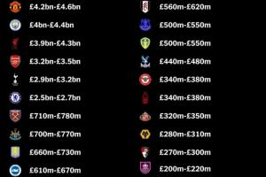 體育資訊12月27日訊 著名媒體《The Athletic》仔細研究了行業(yè)估算,查看了俱樂部最近的財務狀況,并匯總了相關數(shù)據(jù)。包括TA在內(nèi),加上Football Benchmark、福布斯、Kinnaird和Sportico的估計數(shù)值匯總,他們給出了英超20隊的價值區(qū)間。