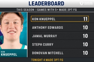 體育資訊12月27日訊 克尼佩爾本賽季已經(jīng)有過11場比賽單場至少命中5記三分,這一數(shù)據(jù)領(lǐng)跑全聯(lián)盟。