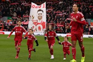 在比賽開(kāi)場(chǎng)前,利物浦隊(duì)長(zhǎng)范戴克帶領(lǐng)若塔的孩子們?cè)诎卜茽柕虑驁?chǎng)踢球。