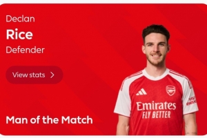 體育資訊12月28日訊 阿森納在本輪英超2-1擊敗布萊頓,賴斯當(dāng)選全場(chǎng)最佳。