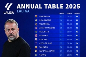 體育資訊12月28日訊 2025年即將過去,《轉(zhuǎn)會(huì)市場(chǎng)》也統(tǒng)計(jì)了2025年西甲總積分榜情況,巴薩獨(dú)自居首。