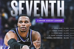 這場比賽威少迎來里程碑,助攻超越魔術(shù)師升至歷史第七位。賽后,威少在社媒上轉(zhuǎn)發(fā)了這一里程碑,他寫道:“感恩這段旅程!”
