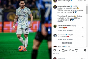 國米中場恰爾汗奧盧社媒曬出比賽照片,并寫道:“以一場勝利結(jié)束這一年,祝大家新年快樂,2026年見。”