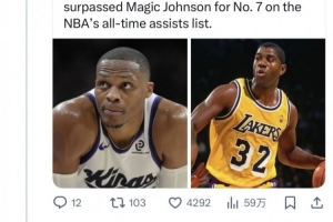 最近,國王后衛(wèi)威斯布魯克在歷史助攻榜上超越魔術師約翰遜,升至歷史第七。