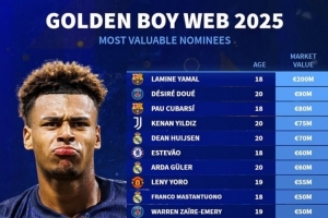 2025金童獎候選身價榜:亞馬爾2億歐 杜埃、伊爾迪茲、赫伊森在列